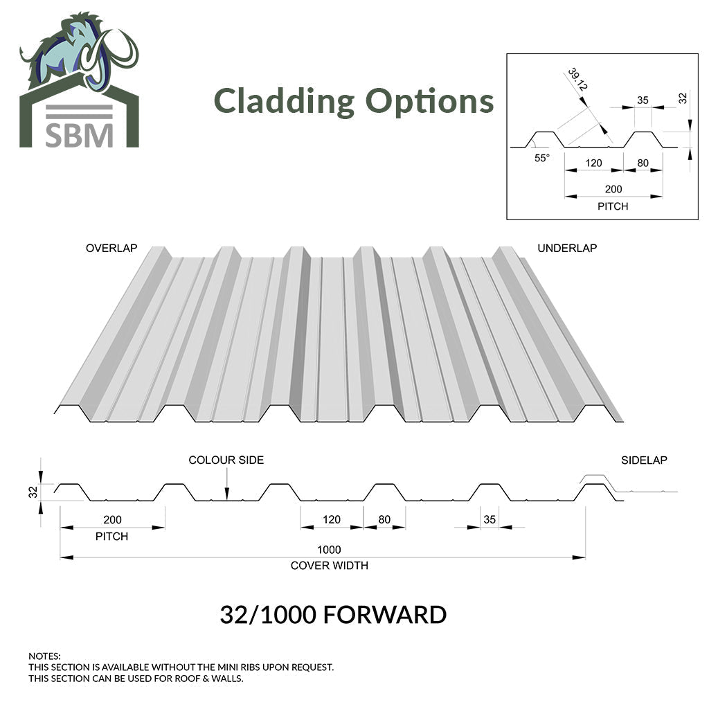With over 300 box profile and corrugated patterns available, there is plenty of variety! But unless you are specifically matching an existing sheet (ie if you need to fit them 'end to end' to extend the run of the roof), the actual profile you use is not usually critical. Most are described by the coverage the sheets gives when lapped side by side, usually 1000mm and the height of the bump or profile, say 32mm. So this profile is known as 1000-32. Many of the patterns vary slightly from each other (due to variations of roll forming machinery between manufacturers). Our range means we will have something suitable for you even if your requirements are of a specialist nature.