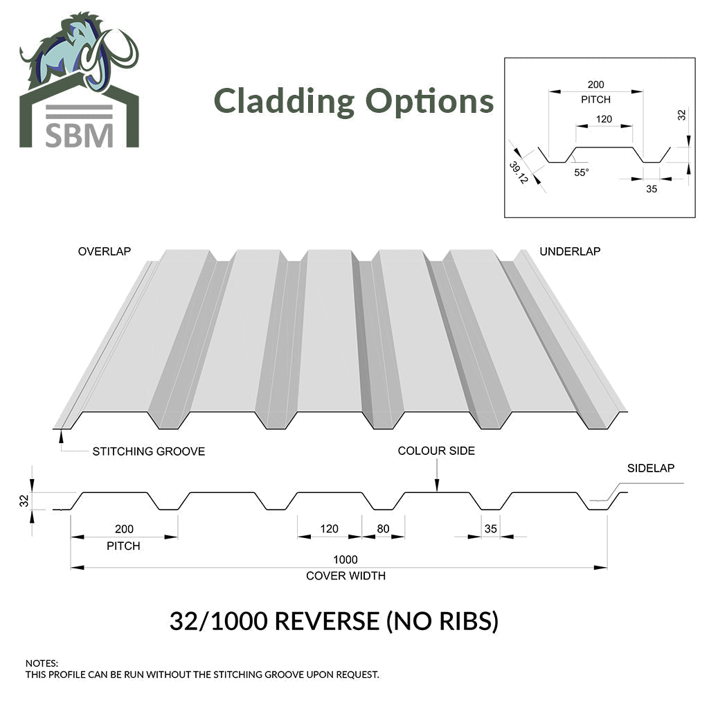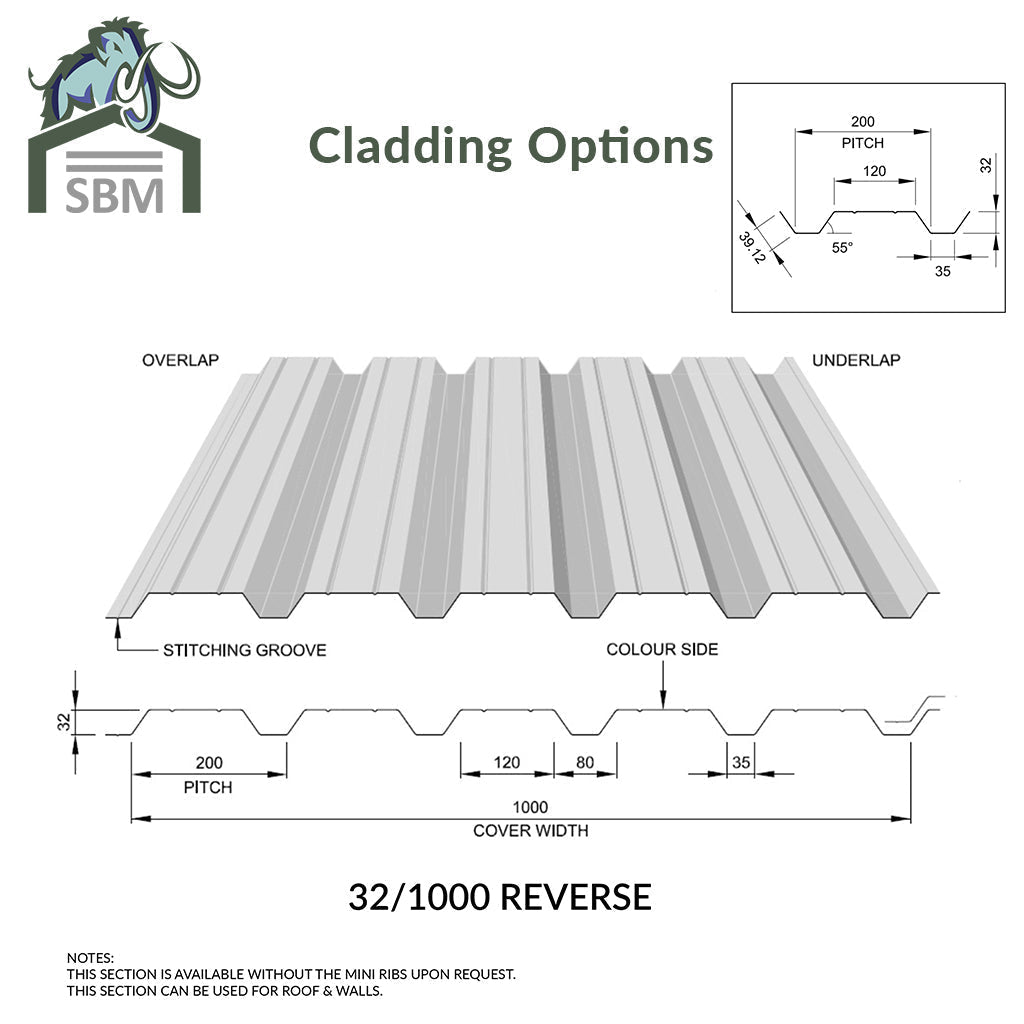 Plastisol Coated Single Skin wall sheeting 32/1000 box profile or Plastisol Finish 40mm Composite Insulated wall sheeting with box profile. As per priced in the options above. |